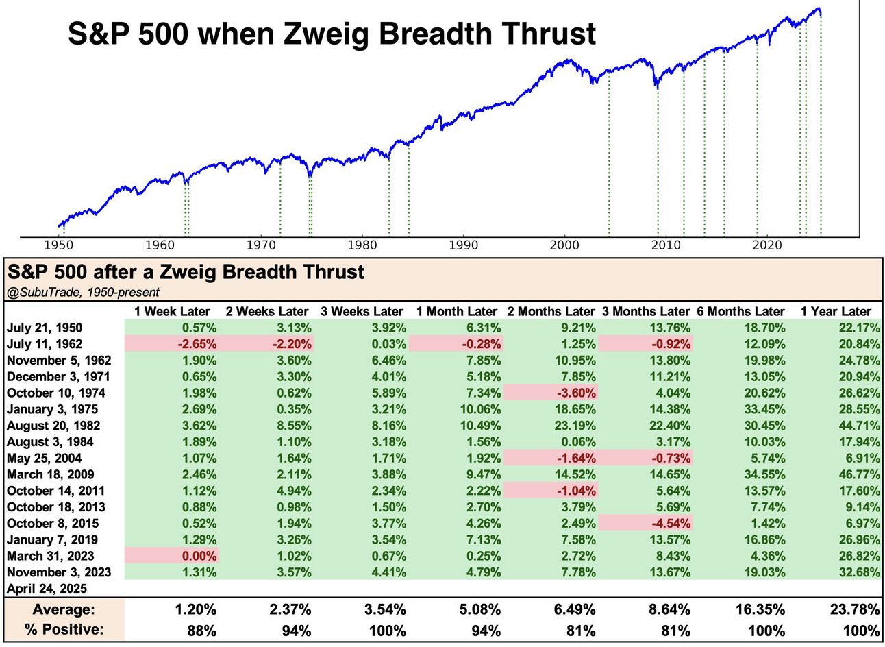 If you’re not familiar, it’s a signal that shows heavy buying pressure coming into the market in a short period of time. Historically, it’s been incredibly accurate at marking major market bottoms.